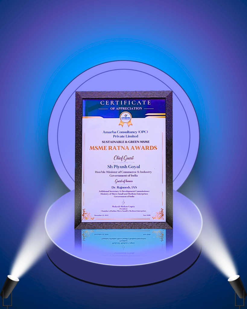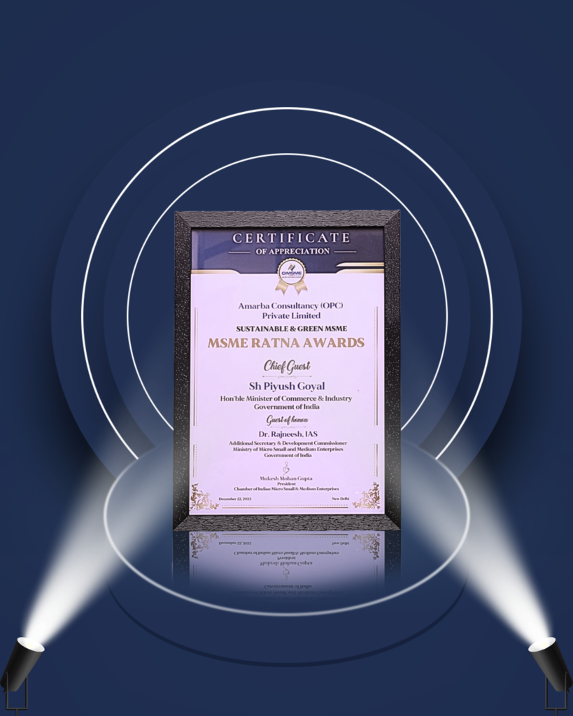 Amarba Consultancy (OPC) Private Limited has been honored with a Certificate of Appreciation for its remarkable contribution to Sustainable & Green MSME development under the MSME Ratna Awards.